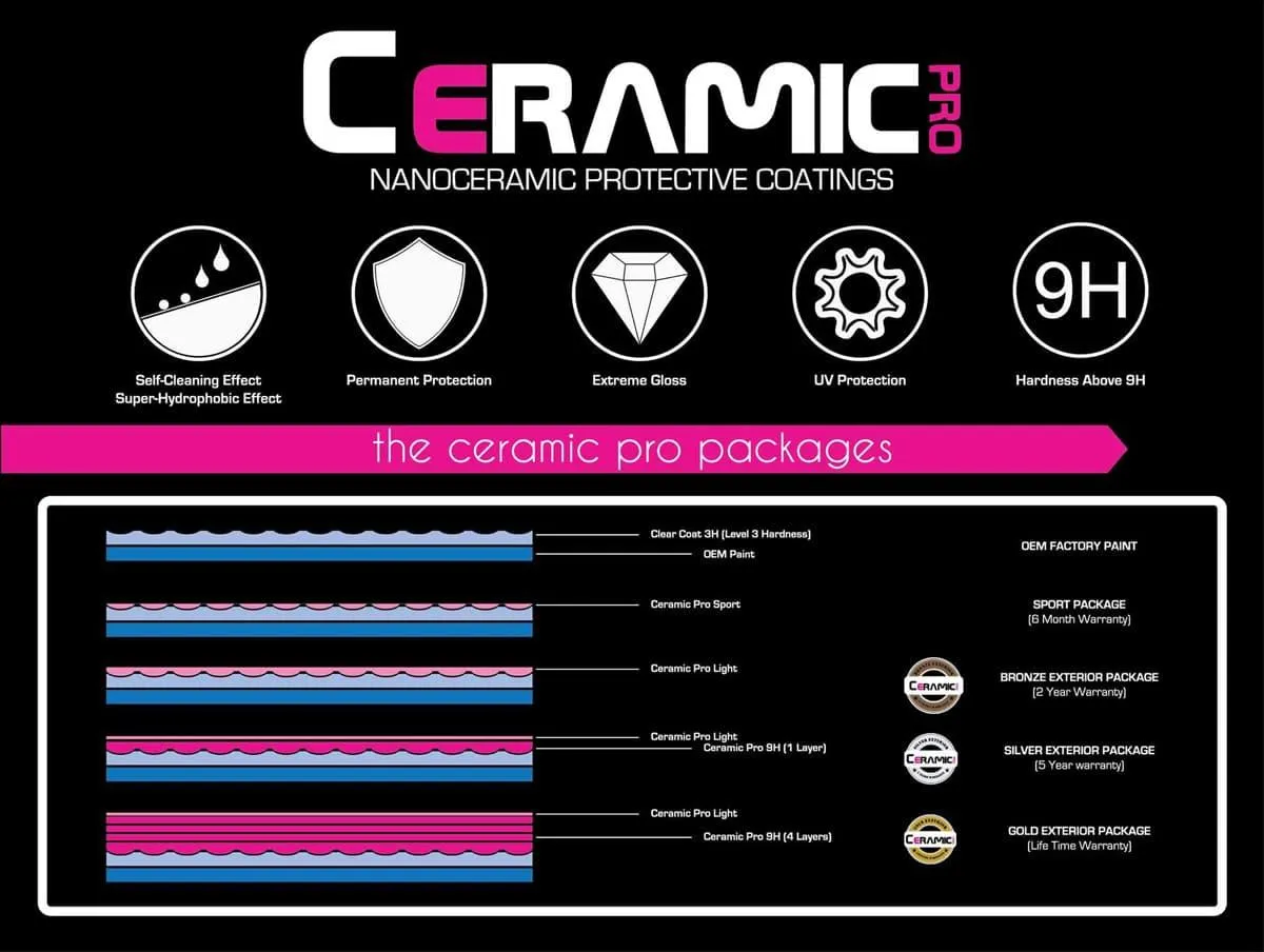 Protect your vehicle from UV rays, dirt, stains, and environmental damage with Ceramic Pro Ceramic Coatings. Our advanced nanotechnology creates a long-lasting, hydrophobic shield for a glossy, showroom finish that lasts for years—no more waxing or frequent maintenance!